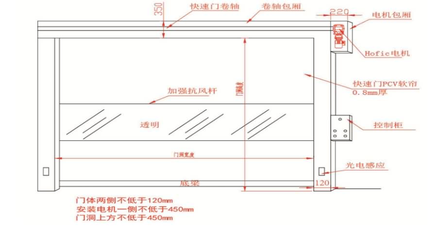 安全裝置:道軌下方裝有紅外線感應(yīng)裝置,快速門卷簾布底部裝有安全氣囊保護