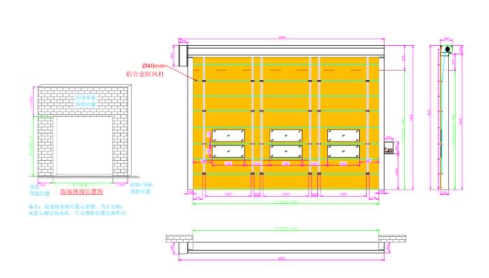 門簾機構(gòu):閃光銀抗風(fēng)壓鋁合金復(fù)合門板;厚度:22-43-60-80mm,標配碳玻璃安全透明視窗,通過軟連接膠條將門板間進行密封,配合采用鋼鋁復(fù)合配重密封底梁