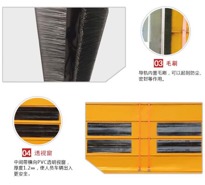 密封性能:底端裝有加重隔氣布,它與各種不平坦地面緊密結(jié)合,道軌配密封毛刷,兩側(cè)全部保持密封