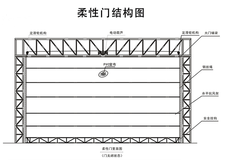 產(chǎn)品介紹:柔性升降機庫門門扇為兩層雙面涂覆聚氯氣乙烯阻燃防水布或類似產(chǎn)品固定在水平鋼龍骨或水平鋁合金龍骨上,龍骨兩端設(shè)有導(dǎo)輪,門扇上、下設(shè)鋼梁等,由配有專用控制控制系統(tǒng)和門體行程限位檢測程序,即時對門體限位進行監(jiān)控。手按開門按鈕,相對應(yīng)的減速機開始轉(zhuǎn)動鋼繩拉起門體下部的過梁沿導(dǎo)軌上移,布簾折疊,開門到位后由限位開關(guān)自動控制門體停止運動。如遇特殊情況,只要按下“急停”按鈕即可斷電,門體停止運行。
